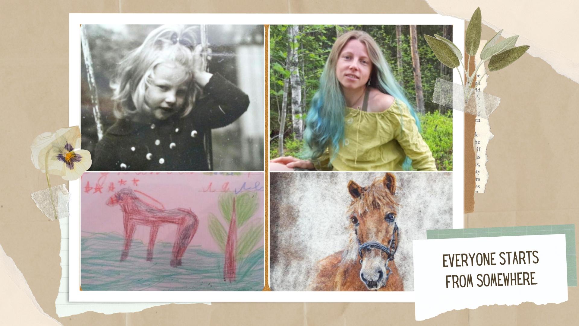 The image captures young Elena alongside her future self, 35 years later, showcasing the evolution of my artistic style. As a child, I could never have imagined creating such intricate wool paintings—it was beyond my wildest dreams. My passion for art has always driven me forward; I express myself through drawing.