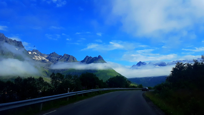 Matkalla Lofoteille pysähdyttiin Bjervigissä ja hämmästelimme veden lämpimyyttä. Paikalinen kertoi, että fjordin vesi Bjervikissa on tosi lämmintä, koska siihen laskeutuu monta jokea, jotka ovat matalia. Tunneleita, vuoria, pilvien korkeudella kaikkialla, serpenttiiniteitä… todella erilaista Suomen luontoon verratuna ja kauniita maisemia koko päivän.
